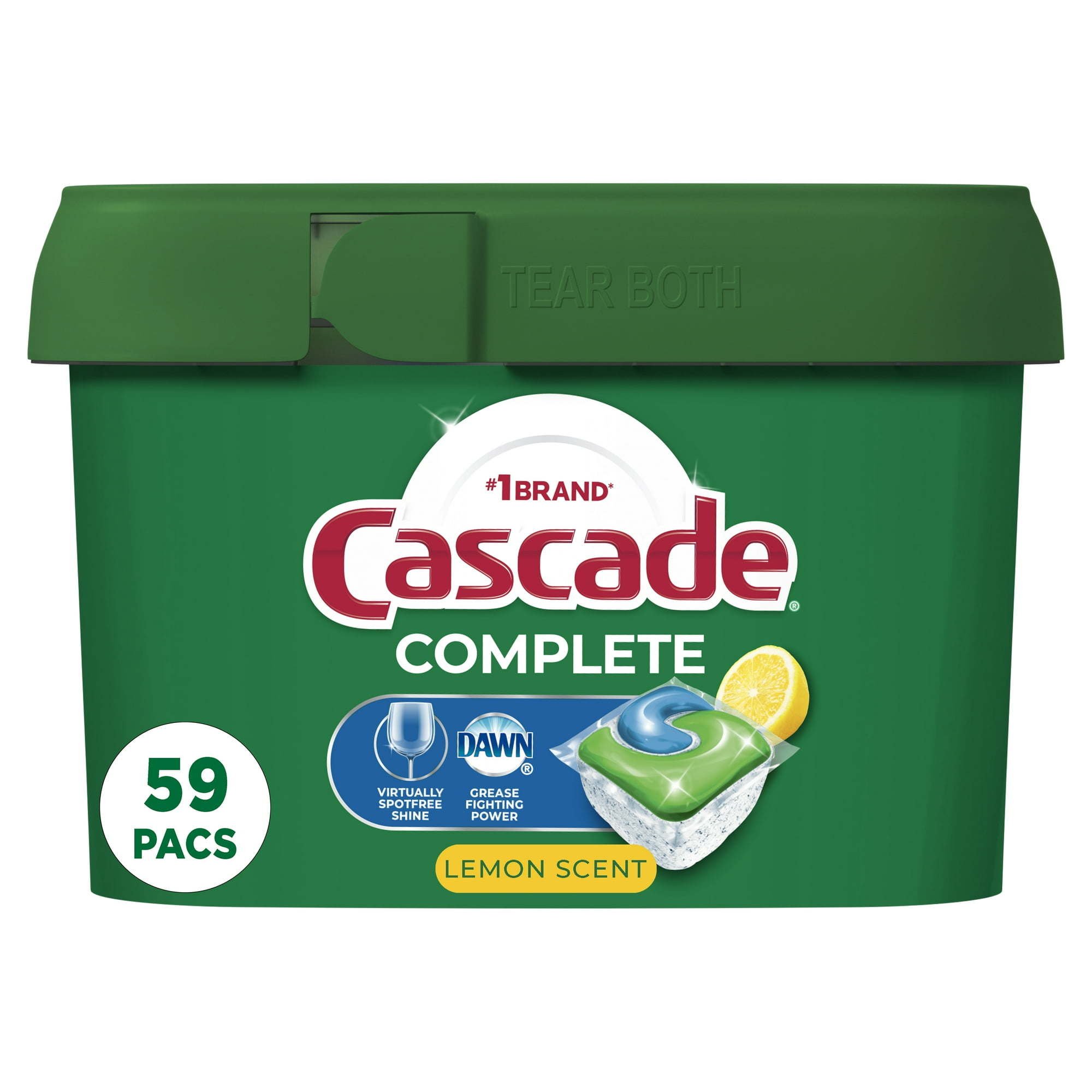 Cascade Complete Action Pacs dishwasher detergent powers away even 24-hour stuck-on messes for a complete clean. That's because every Action Pac has 25% more Cleaning Power* (*% cleaning ingredients vs. Cascade Original) & is formulated with the grease-fighting power of Dawn dishwashing liquid. Cascade Complete Action Pacs are conveniently premeasured with no finicky wrapping-just toss in a pac. Cascade Complete Action Pacs are phosphate free. Plus, Cascade Complete Action Pacs dissolve quickly to unleash cleaning power early in the cycle. Lemon 59 Count