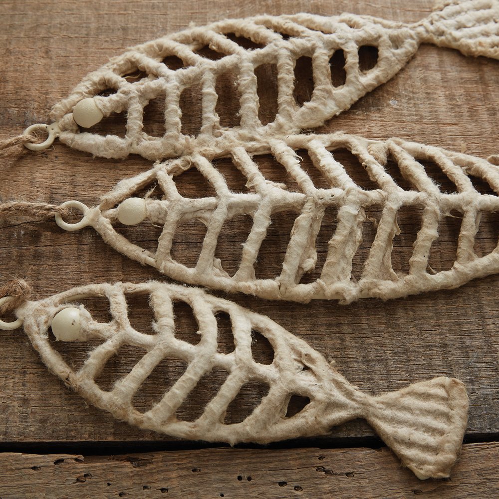 Item is made with a textured fiber overlay on a metal frame. Set of three fish hangs from a 6'' long jute string. Largest is 11¾''H x 3½''W; Medium size is 9¾''H x 3¼''W; Smallest is 7¾''H x 2½''W.